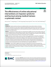 | The effectiveness of online educational interventions on impostor syndrome and burnout among medical trainees: a systematic review Impostor syndrome and burnout are highly prevalent among medical students and trainees, significantly impacting their mental health and professional development. The advent of online educational interventions provides a promising solution, offering accessibility and flexibility to tackle these issues. This systematic review aims to evaluate the effectiveness of online educational interventions in alleviating impostor syndrome and burnout among medical learners. |