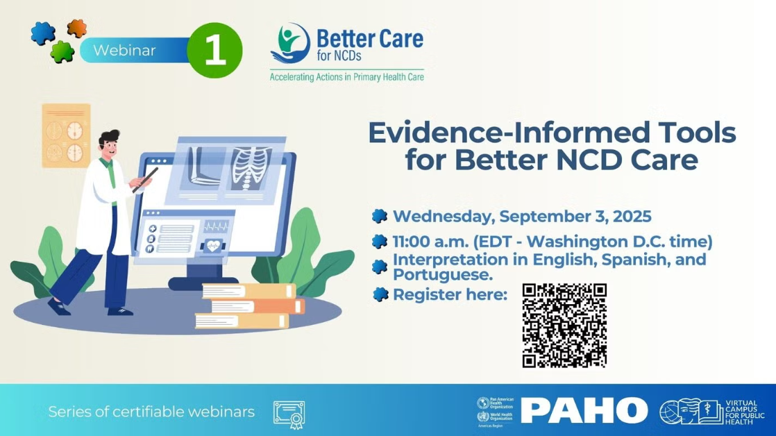 The webinar Evidence-Informed Tools for Better NCD Care, the first webinar in a series of five certifiable webinars from the Better Care for NCDs Initiative. Within the framework of this initiative, PAHO seeks to strengthen the quality of NCD care in primary health care (PHC) through the use of evidence-based tools such as clinical guidelines and protocols. These tools improve quality, efficiency, and a people-centered approach. To support their implementation, PAHO has created a regional dashboard that brings together these resources by country. The objective of the technical webinar is to present these instruments, showcase the dashboard as a support tool, and share practical experiences with their use in health services.
