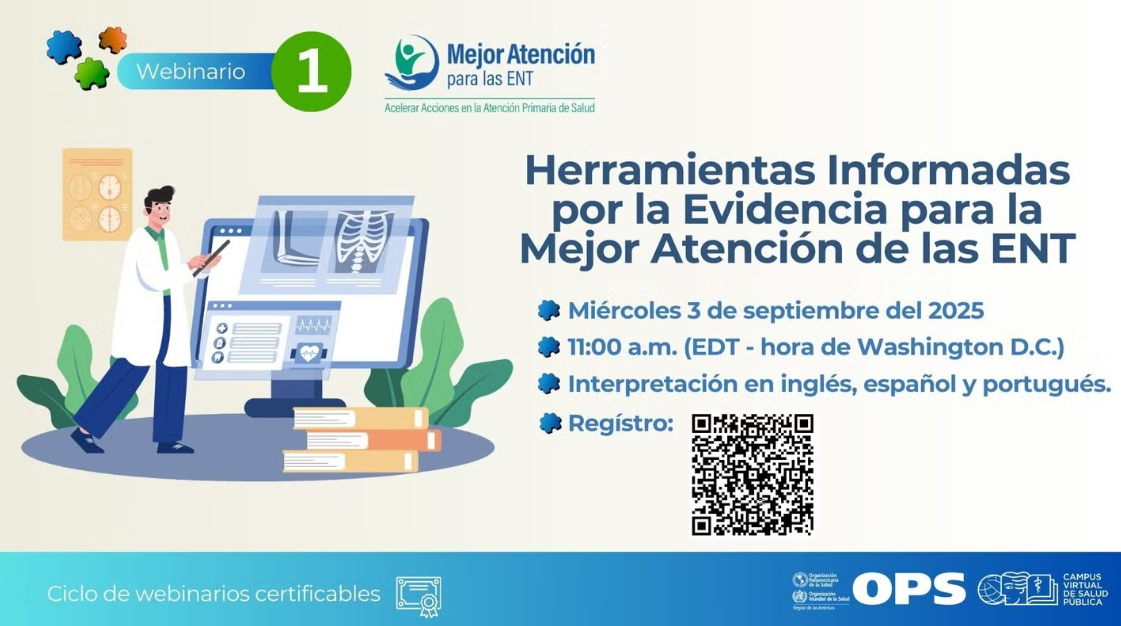 El miércoles, 3 de septiembre de 2025, se realizó el webinar Herramientas Informadas por la evidencia para la Mejor Atención de las Enfermedades No trasnmisibles (ENT), el primer seminario web del ciclo de cinco webinarios certificables de la Iniciativa Mejor Atención para las ENT. En el marco de esta Iniciativa, la OPS busca fortalecerla calidad de la atención de las ENT en la Atención Primaria de Salud (APS) mediante el uso de herramientas basadas en evidencia como guías clínicas y protocolos. Estas herramientas mejoran la calidad, eficiencia y enfoque centrado en las personas. Para apoyar su implementación, la OPS ha creado un tablero de control regional que reúne estos recursos por país. El objetivo del webinario técnico es presentar estos instrumentos, mostrar el tablero como herramienta de apoyo y compartir experiencias prácticas de su uso en los servicios de salud.
