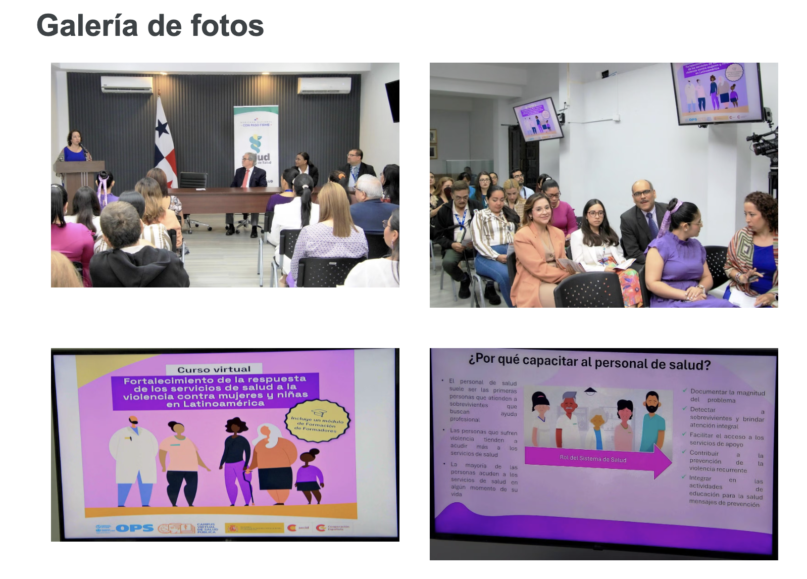 El Ministerio de Salud de Panamá (MINSA), con la colaboración de la Organización Panamericana de la Salud (OPS), inició la implementación del curso virtual "Fortalecimiento de la respuesta de los servicios de salud a la violencia contra las mujeres y niñas en Latinoamérica", diseñado por la OPS con el apoyo financiero de la Agencia Española de Cooperación Internacional para el Desarrollo (AECID). Hasta la fecha 78 personas se encuentran realizando el curso y 26 de ellas ya lo finalizaron obteniendo su certificado.