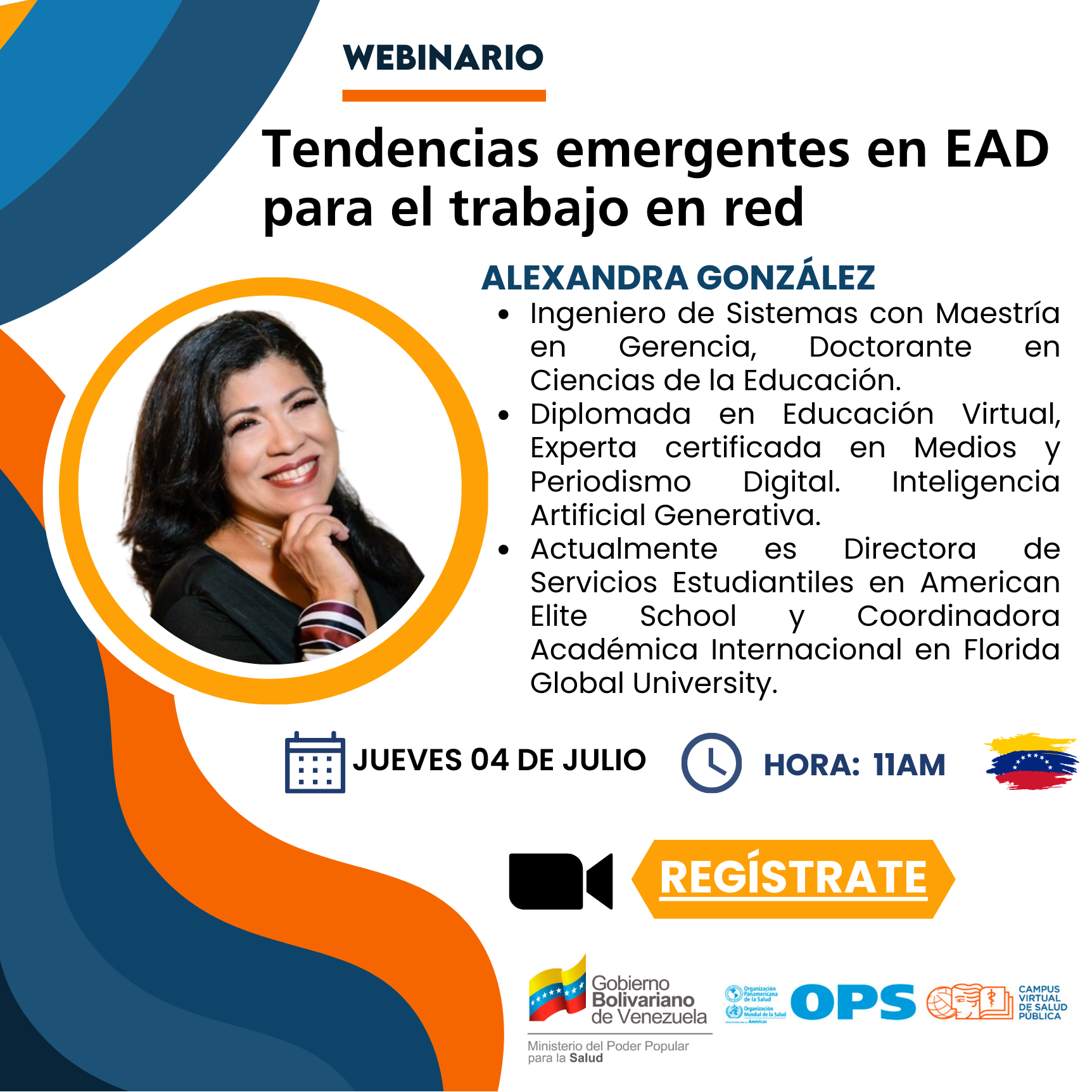 En aras de fortalecer las prácticas de formación en línea, el presente webinar, enmarca su propósito en explorar las diferentes tendencias en Educación a Distancia para favorecer el trabajo en red de las comunidades académicas, con ello alcanzar que los participantes comprenda de manera profunda como las nuevas tecnologías y enfoques pedagógicos están facilitando la colaboración, la comunicación y el aprendizaje entre personas que se encuentran en distintos lugares.